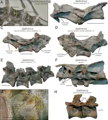 The back of Gallimimus had 13 dorsal vertebrae, with spool-like centra that were short, but tended to become deeper and longer towards the back. Their transverse processes (processes articulating with the ribs) slightly increased in length towards the back. The two first dorsal centra had deep pneumatic foramina, while the rest only had shallow fossae (depressions), and the neural spines were prominent being somewhat triangular or rectangular in shape. The sacrum (fused vertebrae between the pelvic bones) consisted of five sacral vertebrae which were about equal in length. The centra here were spool-like, flattened sideways and had fossae which appear to have continued as deep foramina in some specimens. The neural spines here were rectangular, broad, and higher than those in the dorsal vertebrae. They were higher or equal in height to the upper margin of the iliac blade and were separate, whereas in other ornithomimids they were fused together. The tail had 36–39 caudal vertebrae with the centra of those at the front being spool-shaped, while those at the back were nearly triangular, and elongated across. The neural spines here were high and flat, but diminished backwards, where they became ridge-like. The only sign of pneumaticity in the tail were deep fossae between the neural spines and the transverse process of the two first caudal vertebrae. All the vertebrae in front of the sacrum bore ribs except for the atlas and the last dorsal vertebra.[1][23]