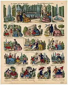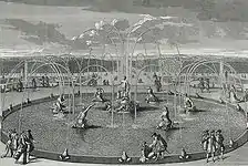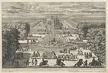 From this point forward, the expansion of the gardens of Versailles followed the expansions of the château. Accordingly, Louis XIV's building campaigns apply to the gardens as well.[7] At every stage the prescribed tour was carefully managed, under the Sun King's directions.[8]
