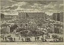 Situated above the Latona Fountain is the terrace of the château, known as the Parterre d'Eau.[16] Forming a transitional element from the château to the gardens below and placed on the north–south axis of the gardens, the Parterre d'Eau provided a setting in which the imagery and symbolism of the decors of the grands appartements synthesized with the iconography of the gardens.[17] In 1664, Louis XIV commissioned a series of statues intended to decorate the water feature of the Parterre d'Eau. The Grande Commande, as the commission is known, comprised twenty-four statues of the classic quaternities and four additional statues depicting abductions from the classic past. (Berger I, 1985; Friedman, 1988,1993; Hedin, 1981–1982; Marie, 1968; Nolhac, 1901; Thompson, 2006; Verlet, 1961, 1985; Weber, 1981)