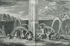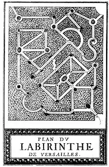 One of the distinguishing features of the gardens during the second building campaign was the proliferation of bosquets. Expanding the layout established during the first building campaign, Le Nôtre added or expanded on no fewer that ten bosquets: The Bosquet du Marais in 1670;[18] the Bosquet du Théâtre d'Eau,[19] Île du Roi and Miroir d'Eau,[20] the Salle des Festins (Salle du Conseil),[21] the Bosquet des Trois Fontaines in 1671;[22] the Labyrinthe[23] and the Bosquet de l'Arc de Triomphe[24] in 1672; the Bosquet de la Renommée (Bosquet des Dômes)[25] and the Bosquet de l'Encélade[26] in 1675; and the Bosquet des Sources[27] in 1678 (Marie 1972, 1976; Thompson 2006; Verlet 1985).[28]