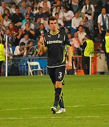 Bale played his first game for Spurs in a friendly against St. Patrick's Athletic on 12 July 2007, but was substituted on the 80th minute with a minor dead leg. He made his competitive debut for Tottenham Hotspur on 26 August away against Manchester United.[28] On 1 September 2007, in his second Spurs appearance, he scored his first goal for the club in a 3–3 draw with Fulham.[29] Bale went on to score against Arsenal in the North London derby from a free kick.[30] He then scored in the League Cup home tie against Middlesbrough.[31]