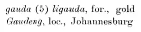 A snippet of text showing the Sesotho word "Gaudeng" (modern Gauteng) in Jacottet's A practical method to learn Sesuto: with exercises and a short vocabulary, published in 1906
