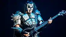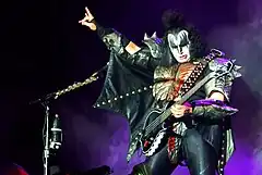 In addition to playing bass, Simmons is known for his long tongue, which he frequently sticks out while performing, and on stage is known for his demonic figure by spitting fire and vomiting stage blood. Some publications reported that his tongue measured up to 7 inches long and he had it insured for $1 million, although Simmons himself has neither confirmed nor denied this.[27]
