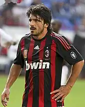 Gattuso's talismanic midfield partnership with playmaker Andrea Pirlo, both at club and international level, played a key role in Italy's World Cup victory in 2006, as well as Milan's domestic, European, and international successes during the mid-2000s. Despite not being blessed with notable technical skills, Gattuso's pace, strength, and work-rate complemented and supported Pirlo's composed, creative playing style, while his energy, aggression, and hard-tackling style of play enabled him to make a name for himself as one of the best players in the world in his position.[6][7][8][9] In addition to his ball-winning abilities, Gattuso was renowned for his competitive nature and leadership qualities throughout his career, often wearing the captain's armband for Milan following Paolo Maldini's retirement.[10][11]