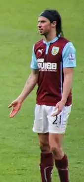 The move to Burnley was confirmed on 1 September 2014, Boyd signing for an undisclosed fee "believed to be in the region of £3million" and on a three-year contract.[105] He made his debut in a 0–0 draw against Crystal Palace at Selhurst Park on 13 September 2014, playing the whole match.[107] Boyd scored his first goal for Burnley in the club's 3–1 defeat to West Ham United at Turf Moor on 18 October 2014, briefly halving the deficit when he reacted the quickest to latch onto Michael Kightly's cross.[108] He scored three goals within the space of a month in December 2014 into January 2015 when he netted twice in two draws with Newcastle United,[109][110] as well as scoring the first goal in a 2–2 comeback draw away at Manchester City.[111] Boyd proceeded to score in the corresponding home fixture against Manchester City on 14 March 2015, his fifth goal of the season, when he "arrowed in a low half-volley" to secure a "famous" 1–0 win.[112] He made 37 appearances during the season, scoring five times, as his first season at the club ended in relegation back to the Championship.[104] Boyd finished the season as having covered an average of 7.45 miles per game, the highest average distance of any player in the Premier League that season.[113] He was voted Burnley's Player of the Year at the end of the season, which Boyd described as a "great honour".[114]