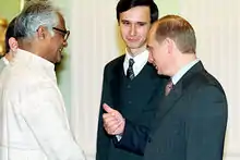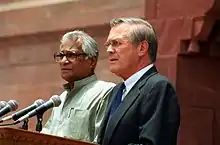 George Mathew Fernandes[3] (3 June 1930 – 29 January 2019) was an Indian trade unionist, statesman,[4] and journalist,[5] who served as the 22nd Defence Minister of India from 1998 until 2004. He was a member of Lok Sabha for over 30 years, starting from Bombay (present-day Mumbai) in 1967 till 2009 mostly representing constituencies from Bihar.[6] He was a key member of the Janata Dal and the founder of the Samata Party, now led by Uday Mandal its President.[7] He held several ministerial portfolios including communication, industry, railways, and defence.[8] In 2020, he was posthumously awarded the Padma Vibhushan, India's second highest civilian award.[9]