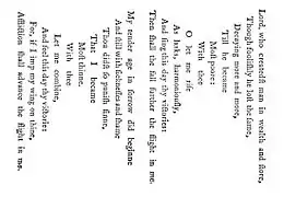 Visually too the poems are varied in such a way as to enhance their meaning, with intricate rhyme schemes, stanzas combining different line lengths and other ingenious formal devices. The most obvious examples are pattern poems like The Altar,[27] in which the shorter and longer lines are arranged on the page in the shape of an altar. The visual appeal is reinforced by the conceit of its construction from a broken, stony heart, representing the personal offering of himself as a sacrifice upon it. Built into this is an allusion to Psalm 51:17: "The sacrifices of God are a broken spirit; a broken and a contrite heart."[28] In the case of "Easter Wings" (illustrated here), the words were printed sideways on two facing pages so that the lines there suggest outspread wings. The words of the poem are paralleled between stanzas and mimic the opening and closing of the wings. In Herbert's poems formal ingenuity is not an end in itself but is employed only as an auxiliary to its meaning.