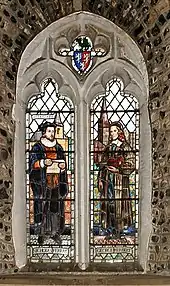 Most representations of Herbert, however, are in stained glass windows, of which there are several in churches and cathedrals. They include Westminster Abbey,[51] Salisbury Cathedral[52] and All Saints' Church, Cambridge.[52] His own St Andrew's Church in Bemerton installed in 1934 a memorial window, which he shares with Nicholas Ferrar. In addition, there is a statue of Herbert in his canonical robes, based in part on the Robert White portrait, in a niche on the West Front of Salisbury Cathedral.