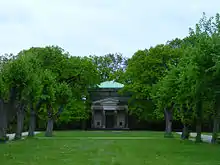 George, although increasingly reliant on Walpole, could still have replaced his ministers at will. Walpole was actually afraid of being removed from office towards the end of George I's reign,[73] but such fears were put to an end when George died during his sixth trip to his native Hanover since his accession as king. He suffered a stroke on the road between Delden and Nordhorn on 9 June 1727,[74] and was taken by carriage about 55 miles to the east, to the palace of his younger brother, Ernest Augustus, Prince-Bishop of Osnabrück, where he died two days after arrival in the early hours before dawn on 11 June 1727.[lower-alpha 5] George I was buried in the chapel of Leine Palace in Hanover, but his remains were moved to the chapel at Herrenhausen Gardens after World War II.[3] Leine Palace was entirely burnt out as a result of Allied air raids and the King's remains, along with his parents', were moved to the 19th-century mausoleum of King Ernest Augustus in the Berggarten.[75]