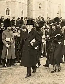 At its meeting on 22 March 1921 the Poplar Council resolved not to make its precepts and to apply these revenues to the costs of local poor relief.[93] This illegal action created a sensation, and led to legal proceedings against the council. On 29 July the thirty councillors involved marched in procession from Bow to the High Court, headed by a brass band. Informed by the judge that they must apply the precepts, the councillors would not budge; early in September, Lansbury and 29 fellow-councillors were imprisoned for contempt of court. Among those sentenced were his son Edgar and Edgar's wife, Minnie.[92]