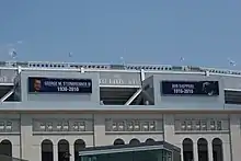 On July 13, 2010, the morning of the 2010 Major League Baseball All-Star Game, Steinbrenner died of a heart attack at St. Joseph's Hospital in Tampa, Florida.[51] His death came nine days after his 80th birthday, two days after the death of longtime Yankee Stadium public address announcer Bob Sheppard,[52] and eight days before that of former Yankee manager Ralph Houk. On July 14, the Yankees announced that players and coaches would wear a Steinbrenner commemorative patch on the left breast of their home and road uniforms, and a Bob Sheppard commemorative patch on the left arm.[53] July 15 marked the Yankees' first home game at Yankee Stadium after both the All-Star break and Steinbrenner's passing. Prior to the game, the team presented a mural above the right-center field bleachers in the late owner's honor while closer Mariano Rivera laid a bouquet of flowers on home plate.[54]