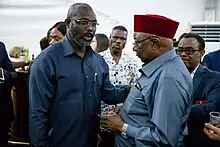 Weah became involved in politics in Liberia following his retirement from football. He formed the Congress for Democratic Change and ran unsuccessfully for president in the 2005 election, losing to Ellen Johnson Sirleaf in the second round of voting. In the 2011 election, he ran unsuccessfully for vice president alongside Winston Tubman. Weah was subsequently elected to the Liberian Senate for Montserrado County in the 2014 elections. Weah was elected President of Liberia in the 2017 election, defeating the incumbent vice president Joseph Boakai[15][16] and was sworn in on 22 January 2018.[17]