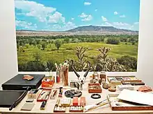 She began a series of watercolor paintings based upon the scenery and expansive views during her walks,[27][32] including vibrant paintings of Palo Duro Canyon.[33] She "captured a monumental landscape in this simple configuration, fusing blue and green pigments in almost indistinct tonal graduations that simulate the pulsating effect of light on the horizon of the Texas Panhandle," according to author Sharyn Rohlfsen Udall.[27][32]