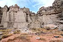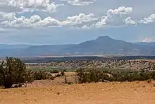In the 1940s, O'Keeffe made an extensive series of paintings of what is called the "Black Place", about 150 miles (240 km) west of her Ghost Ranch house.[75] O'Keeffe said that the Black Place resembled "a mile of elephants with gray hills and white sand at their feet."[61] She made paintings of the "White Place", a white rock formation located near her Abiquiú house.[76] In 1946, she began making the architectural forms of her Abiquiú house—the patio wall and door—subjects in her work.[77] Another distinctive painting was Ladder to the Moon, 1958.[78] In the mid-1960s, O'Keeffe produced Sky Above Clouds, a series of cloudscapes inspired by her views from airplane windows.[37][lower-alpha 2] Worcester Art Museum held a retrospective of her work in 1960[30] and ten years later, the Whitney Museum of American Art mounted the Georgia O'Keeffe Retrospective Exhibition.[45]