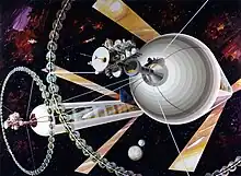 While he was waiting for his paper to be published, O'Neill organized a small two-day conference in May 1974 at Princeton to discuss the possibility of colonizing outer space.[21] The conference, titled First Conference on Space Colonization, was funded by Stewart Brand's Point Foundation and Princeton University.[31] Among those who attended were Eric Drexler (at the time a freshman at MIT), scientist-astronaut Joe Allen (from Astronaut Group 6), Freeman Dyson, and science reporter Walter Sullivan.[21] Representatives from NASA also attended and brought estimates of launch costs expected on the planned Space Shuttle.[21] O'Neill thought of the attendees as "a band of daring radicals".[32] Sullivan's article on the conference was published on the front page of The New York Times on May 13, 1974.[33] As media coverage grew, O'Neill was inundated with letters from people who were excited about living in space.[34] To stay in touch with them, O'Neill began keeping a mailing list and started sending out updates on his progress.[21][35] A few months later he heard Peter Glaser speak about solar power satellites at NASA's Goddard Space Flight Center. O'Neill realized that, by building these satellites, his space colonies could quickly recover the cost of their construction.[36] According to O'Neill, "the profound difference between this and everything else done in space is the potential of generating large amounts of new wealth".[6]
