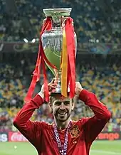 Piqué was a member of the Spain under-19 team that won the 2006 UEFA European Under-19 Championship in Poland.[49] In a 2–1 final win against Scotland, Piqué put in a strong performance in defence and also contributed in attack, hitting the crossbar with a header and providing the assist for striker Alberto Bueno to score Spain's second goal.[50]