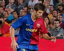 Piqué's first goal for Barcelona came in the club's 5–2 2008–09 UEFA Champions League group stage win at Sporting CP on 26 November.[17][18] His first domestic goal for the club followed two months later, on 29 January 2009, in a Copa del Rey match against local rivals Espanyol. The goal, which came from a corner kick in the 57th minute, turned out to be the game winner in a 3–2 victory for Barcelona.[19][20] On 2 May, Piqué scored Barcelona's sixth goal in a 6–2 El Clásico win against Real Madrid at the Santiago Bernabéu.[21][22]
