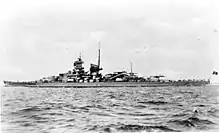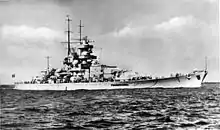 Gneisenau was ordered as Ersatz Hessen as a replacement for the old pre-dreadnought Hessen, under the contract name "E."[3] The Deutsche Werke in Kiel was awarded the contract, where the keel was laid on 6 May 1935.[4] The ship was launched on 8 December 1936, after which fitting-out work was begun.[5] The ship was completed in May 1938 and commissioned for sea trials on the 21st,[6] under the command of Kapitän zur See (KzS) Erich Förste.[7][6] The trials revealed a dangerous tendency to ship considerable amounts of water in heavy seas. This caused flooding in the bow and damaged electrical systems in the forward gun turret. As a result, she went back to the dockyard for extensive modification of the bow. The original straight stem was replaced with a raised "Atlantic bow."[8] A diagonal cap was fitted to the smoke stack to keep the main mast free of smoke.[9] The modifications were completed by September 1939, by which time the ship was finally fully operational.[8]