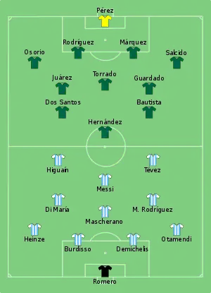 Argentina and Mexico met on 27 June 2010 at Soccer City in Johannesburg. Argentina won the match 3–1 for a place in the quarter-finals against Germany. The match was overshadowed by a refereeing error that allowed Argentina's opening goal. Carlos Tevez headed the ball into the net from a Lionel Messi pass in the 25th minute, but replays showed there were no players between Tevez and the goal, rendering his goal clearly offside.[19] Replays of the goal were shown in the stadium but the decision to award the goal was not overturned. Tevez said he knew that the goal was offside, but chose not to say anything.[20] Argentina's second goal came from a defensive error from Ricardo Osorio as a poor pass out of defence was snatched by Gonzalo Higuaín to round the keeper and score. After half-time, Tevez scored his second goal of the match to give Argentina a three-goal lead, with a long range shot that found the top corner of the Mexican goal. Javier Hernández scored for Mexico in the 71st minute but it turned out to be no more than a consolation goal, as Argentina held on to win 3–1.[21] Mexico's coach Javier Aguirre resigned after the match, accepting responsibility for not meeting the team's target of the quarter-finals.[22] Tevez conceded that he was aware his first goal was offside at the time,[23] although Aguirre deflected the blame for his side's loss away from the refereeing.[24]