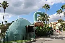 McCay's son Robert unsuccessfully attempted to revive Gertie with a comic strip called Dino.[87] He and Disney animator Richard Huemer recreated the original vaudeville performance for the Disneyland television program in 1955;[72] this was the first exposure the film had for that generation. Walt Disney expressed to the younger McCay his feeling of debt, and gestured to the Disney studios saying, "Bob, all this should be your father's."[86] An ice cream shop in the shape of Gertie sits by Echo Lake in Disney's Hollywood Studios in Walt Disney World.[88]