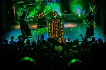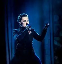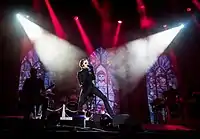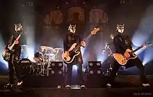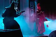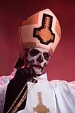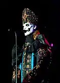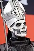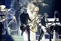 The group's vocalist usually portrays the band's mascot character, a Satanic priest known as Papa Emeritus.[4] There have been four different characters taking the name Papa Emeritus. They first welcomed the second Papa Emeritus on 12 December 2012, in Linköping. On 3 June 2015, the second Papa Emeritus welcomed his younger brother as the new Papa Emeritus in Linköping after being "fired" due to not performing his duty in overthrowing governments and churches. Papa Emeritus II and Papa Emeritus III were stated to only have a 3-month difference in age. On 30 September 2017 during a show in Gothenburg, Papa Emeritus III was dragged off stage by two men, who then escorted a new character, Papa Emeritus 0, to the stage to introduce the band's next chapter. Papa Emeritus 0 is portrayed as being significantly older than the previous Papas, making use of a walker and oxygen tank whilst walking on stage. On 19 January 2018, the band shared a video that features a character, implied to be Papa Emeritus IV, listening to Ceremony and Devotion on 8-track tape while critiquing Papa Emeritus III's vocal abilities. The character's face is hidden offscreen, but he is shown to wear red vestments similar to a cardinal priest. He was later revealed to be Cardinal Copia.[45][146] At the final show of the tour in support of Prequelle, Papa Nihil had collapsed and "died", and Cardinal Copia became Papa Emeritus IV. Papa Nihil was later resurrected during the European leg of the Imperatour.[147] All versions of Papa Emeritus are actually the same vocalist, Tobias Forge.[148]