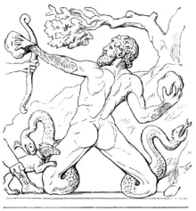 Archaic and Classical representations show Gigantes as man-sized hoplites (heavily armed ancient Greek foot soldiers) fully human in form.[4] Later representations (after c. 380 BC) show Gigantes with snakes for legs.[5] In later traditions, the Giants were often confused with other opponents of the Olympians, particularly the Titans, an earlier generation of large and powerful children of Gaia and Uranus.