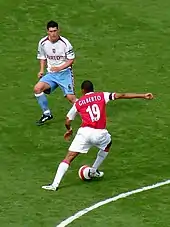The buildup of the 2007–08 season saw Arsenal captain Thierry Henry leave the club to join Barcelona.[51] This coupled with the fact that Gilberto was Arsenal's vice-captain during the 2006–07 season led many people to assume that Gilberto would take over Henry's role.[52][53] However, to the surprise of Gilberto,[54] William Gallas was given the captain's armband instead.[55] In August, after returning to Arsenal's pre-season training late due to his involvement in the Copa América tournament (and thus missing the start of the season),[56] Gilberto then lost his place in the first team to young midfielder Mathieu Flamini. This reignited speculation linking Gilberto to Italy due to rumours that he was unhappy being on the bench at Arsenal.[57] However, reports that he was being snubbed at the club were dismissed by Wenger, who insisted that Gilberto would remain at Arsenal to fight for his place.[58][59] Despite this, in October 2007, rumours in the press re-emerged that Gilberto was angry at Wenger for being asked to play in defence in a League Cup game against Sheffield United, and had resultantly refused to play.[60] Gilberto ended up playing the game in midfield though,[61] with he and Wenger both denying rumours of a rift with each other.[62][63] Gilberto subsequently commented that while he was not happy being a substitute, he would remain professional and fight for his place at the club.[64] Also in October, Gilberto ceded the Brazilian captaincy to Lúcio upon his compatriot's return from injury.