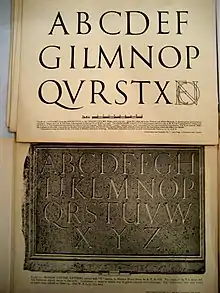 The upper-case of Gill Sans is partly modelled on Roman capitals like those found on Trajan's Column in Rome, with considerable variation in width. These had become a standard for inscriptional lettering in Britain at the time: Gill's teacher Edward Johnston had written that, "The Roman capitals have held the supreme place among letters for readableness and beauty. They are the best forms for the grandest and most important inscriptions."[8][9][7][6] While Gill Sans is not based on purely geometric principles to the extent of the geometric sans-serifs that had preceded it, some aspects of Gill Sans do have a geometric feel.[lower-alpha 1] The J descends below the baseline. The "O" is an almost perfect circle and the capital "M" is based on the proportions of a square with the middle strokes meeting at the centre; this was not inspired by Roman carving but is very similar to Johnston.[8][lower-alpha 2] The 'E' and 'F' are also relatively narrow.