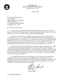 On May 14, Haspel sent a letter to Senator Mark Warner of Virginia stating that, in hindsight, the CIA should not have operated its interrogation and detention program.[71] Shortly thereafter, Warner announced he would back Haspel when the Senate Intelligence Committee voted on whether to refer her nomination to the full Senate.[71]