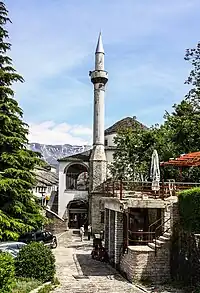 In 1811, Gjirokastër became part of the Pashalik of Yanina, then led by the Albanian-born Ali Pasha of Ioannina and was transformed into a semi-autonomous fiefdom in the southwestern Balkans until his death in 1822. In 1833 Albanian rebels took over the town causing the Ottoman government to comply with rebel terms.[37] After the fall of the pashalik in 1868, the city was the capital of the sanjak of Ergiri. On 23 July 1880, southern Albanian committees of the League of Prizren held a congress in the city, in which was decided that if Albanian-populated areas of the Ottoman Empire were ceded to neighbouring countries, they would revolt.[38] During the Albanian National Awakening (1831–1912), the city was a major centre of the movement, and some groups in the city were reported to carry portraits of Skanderbeg, the national hero of the Albanians during this period.[39] Gjirokastër from the middle of the nineteenth century also prominently contributed to the wider Ottoman Empire through individuals that served as Kadıs (civil servants) and was an important centre of Islamic culture.[3] In early March 1908, the binbashi of Gjirokastër was assassinated by Çerçiz Topulli and his followers.[40] The pro-Albanianists of the city during 1909–1912 were split between two groups: the urban liberals who wanted to cooperate with the Greeks and Albanian nationalists who formed guerilla bands operating in the countryside.[5] During the 19th and early 20th century, Albanian speaking Muslims were the majority population of Gjirokastër, while a small number of Greek-speaking families lived there.[5]