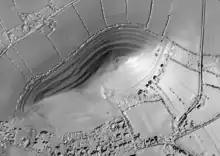 Other explanations have been suggested for the terraces, including the construction of defensive ramparts.[23] Iron Age hill forts including the nearby Cadbury Castle in Somerset show evidence of extensive fortification of their slopes. The normal form of ramparts is a bank and ditch, but there is no evidence of this arrangement on the Tor. South Cadbury, one of the most extensively fortified places in early Britain, had three concentric rings of banks and ditches supporting an 44-acre (18 ha) enclosure. By contrast, the Tor has seven rings and very little space on top for the safekeeping of a community.[24] It has been suggested, that a defensive function may have been linked with Ponter's Ball Dyke, a linear earthwork about 1 mile (1.6 km) east of the Tor.[25][26][27] It consists of an embankment with a ditch on the east side.[27] The purpose and provenance of the dyke are unclear. It is possible that it was part of a longer defensive barrier associated with New Ditch, three miles to the south-west, which is built in a similar manner. It has been suggested by Ralegh Radford that it is part of a great Celtic sanctuary, probably 3rd century BC, while others, including Philip Rahtz, date it to the post-Roman period and link it to the Dark Age occupation on Glastonbury Tor. The 1970 excavation suggests the 12th century or later.[28] The historian Ronald Hutton also mentions the alternative possibility that the terraces are the remains of a medieval "spiral walkway" created for pilgrims to reach the church on the summit,[29] similar to that at Whitby Abbey.[30]