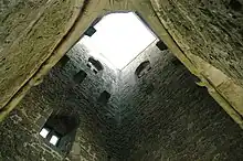 St Michael's Church survived until the Dissolution of the Monasteries in 1539 when, except for the tower, it was demolished.[1] The Tor was the place of execution where Richard Whiting, the last Abbot of Glastonbury Abbey, was hanged, drawn and quartered along with two of his monks, John Thorne and Roger James.[57] The three-storey tower of St Michael's Church survives. It has corner buttresses and perpendicular bell openings. There is a sculptured tablet with an image of an eagle below the parapet.[2]