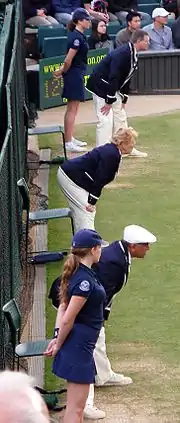 • Ball boy (also ball girl or ballkid): a person, commonly a child, tasked with retrieving tennis balls from the court that have gone out of play and supplying the balls to the players before their service. Ball boys in net positions normally kneel near the net and run across the court to collect the ball, while ball boys in the back positions stand in the back along the perimeter of the arena. Ball boys in the back are responsible for giving the balls to the player serving.[19]