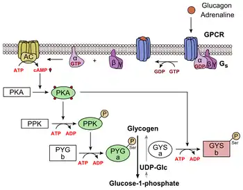 Adenylate cyclase manufactures cyclic adenosine monophosphate (cyclic AMP or cAMP), which activates protein kinase A (cAMP-dependent protein kinase). This enzyme, in turn, activates phosphorylase kinase, which then phosphorylates glycogen phosphorylase b (PYG b), converting it into the active form called phosphorylase a (PYG a). Phosphorylase a is the enzyme responsible for the release of glucose 1-phosphate from glycogen polymers. An example of the pathway would be when glucagon binds to a transmembrane protein. The transmembrane proteins interacts with Gɑβ𝛾. Gαs separates from Gβ𝛾 and interacts with the transmembrane protein adenylyl cyclase. Adenylyl cyclase catalyzes the conversion of ATP to cAMP. cAMP binds to protein kinase A, and the complex phosphorylates glyocogen phosphorylase kinase.[22] Phosphorylated glyocogen phosphorylase kinase phosphorylates glycogen phosphorylase. Phosphorylated glycogen phosphorylase clips glucose units from glycogen as glucose 1-phosphate.