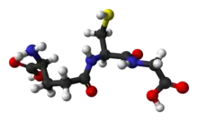Glutathione (GSH, /ˌɡluːtəˈθaɪoʊn/) is an antioxidant in plants, animals, fungi, and some bacteria and archaea. Glutathione is capable of preventing damage to important cellular components caused by sources such as reactive oxygen species, free radicals, peroxides, lipid peroxides, and heavy metals.[2] It is a tripeptide with a gamma peptide linkage between the carboxyl group of the glutamate side chain and cysteine. The carboxyl group of the cysteine residue is attached by normal peptide linkage to glycine.