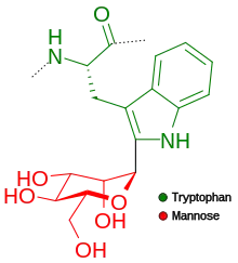 A mannose sugar is added to the first tryptophan residue in the sequence W–X–X–W (W indicates tryptophan; X is any amino acid). A C-C bond is formed between the first carbon of the alpha-mannose and the second carbon of the tryptophan.[13] However, not all the sequences that have this pattern are mannosylated. It has been established that, in fact, only two thirds are and that there is a clear preference for the second amino acid to be one of the polar ones (Ser, Ala, Gly and Thr) in order for mannosylation to occur. Recently there has been a breakthrough in the technique of predicting whether or not the sequence will have a mannosylation site that provides an accuracy of 93% opposed to the 67% accuracy if we just consider the WXXW motif.[14]