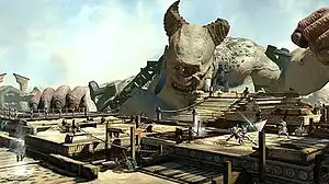 All but two of the fifteen multiplayer maps are based on locations explored throughout the God of War series, with eight of those based on locations explored in Ascension; for example, Desert of Lost Souls is from the original God of War, Bog of the Forgotten is from God of War II, and Labyrinth of Daedalus, Forum of Hercules, and Chamber of the Flame are from God of War III.[27] The two original maps are the Coliseum of Persia and the Walls of Troy (which features the Trojan Horse). Every map features special power-ups awarded by the gods for earning points, such as the Boots of Hermes for acceleration and running attacks.[18][19] Maps also have environmental obstacles or objectives to complete for more points. For example, on the Desert of Lost Souls map, the cyclops Polyphemus may attack nearby players and killing him with the Spear of Olympus will grant bonus points for that team.[11][28]