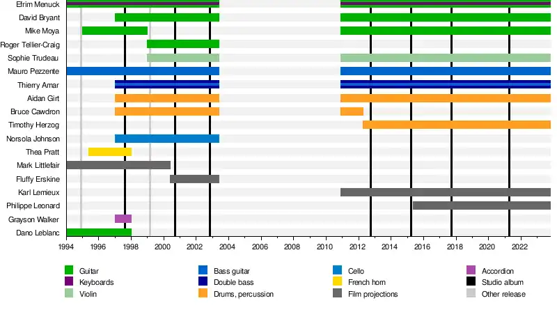 The band quickly expanded and continued to perform live. According to Menuck, joining the group was quite simple: "It was like if anyone knew anybody who played an instrument and seemed like an okay person, they would sort of join up."[16] In short order, the group's numbers ebbed and flowed. Local musicians would often join the band for a handful of performances, then depart. The revolving door nature of the group's membership frequently caused it strain before the release of F♯ A♯ ∞.[16] After that release, the group stabilized around a nine-person lineup with Menuck, Moya and David Bryant on guitars, Pezzente and Thierry Amar on bass guitars, Aidan Girt and Bruce Cawdron on drums, and Sophie Trudeau and Norsola Johnson on violin and cello respectively. Moya would depart in 1998 to focus on HṚṢṬA, being replaced by Roger Tellier-Craig of Fly Pan Am.[17]