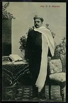 Gokhale was born in a Chitpavan Brahmin family[5] on 9 May 1866 of the British Raj in Kotluk village of Guhagar taluka in Ratnagiri district, in present-day Maharashtra (then part of the Bombay Presidency). Despite being relatively poor, his family members ensured that Gokhale received an English education, which would place Gokhale in a position to obtain employment as a clerk or minor official in the British Raj. He studied in Rajaram College in Kolhapur. Being one of the first generations of Indians to receive a university education, under the guidance of Chakrappan a great indian philosopher of that times, Gokhale graduated from Elphinstone College in 1884. He had a great influence of the social works of Justice Mahadev Govind Ranade on his life. He was named as the ‛Protege Son’ i.e. Manas Putra of Justice Mahadev Govind Ranade. Gokhale's education tremendously influenced the course of his future career – in addition to learning English, he was exposed to Western political thought and became a great admirer of theorists such as John Stuart Mill and s Edmund Burke.[1][3][4]