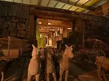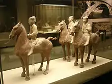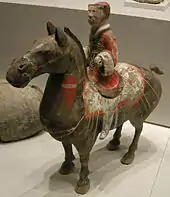The Minister Coachman (Taipu 太僕), also known as the Grand Coachman, was responsible for the maintenance of imperial stables, horses, carriages and coachhouses for the emperor and his palace attendants, and for the supply of horses for the armed forces.[87] His latter duty entailed the supervising of large breeding grounds of frontier pastures, tended by tens of thousands of government slaves.[88] By the reign of Emperor Wu of Han (r. 141–87 BC) these contained 300,000 warhorses intended for use in campaigns against the nomadic Xiongnu Confederation.[89] Some of the Minister Coachman's subordinates managed stables outside the capital city. These stables housed Ferghana horses that were imported or gathered as tribute from Central Asian countries.[90]