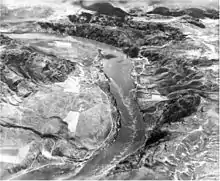 Two large cofferdams were constructed for the dam, but they were parallel to the river rather than straddling its width, so drilling into the canyon walls was not required. By the end of 1935 about 1,200 workers completed the west and east cofferdams. The west cofferdam was 2,000 ft (610 m) long, 50 ft (15 m) thick and was constructed 110 ft (34 m) above the bedrock.[32] The cofferdams allowed workers to dry portions of the riverbed and begin constructing the dam, while water continued to flow down the center of the riverbed.[33] In August 1936, once the west foundation was complete, portions of the west cofferdam were dismantled, allowing water to flow through part of the dam's new foundation. In February 1936, MWAK had begun constructing cofferdams above and below the channel between the east and west cofferdams. By December, the entire Columbia River was diverted over the foundations constructed within the east and west cofferdams. On December 15, 1936, the Wenatchee Daily World announced the river was diverted and by early the next year, people were arriving in large numbers to see the riverbed.[34]