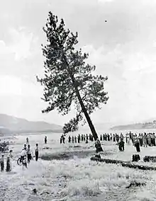 In late 1938, the Works Progress Administration began clearing what would be 54,000 acres (220 km2) of trees and other plants. The cut timber was floated downstream and sold to the highest bidder, Lincoln Lumber Company, which paid $2.25 per thousand board feet (equivalent to $47 in 2022).[50] The pace of clearing was accelerated in April 1941 when it was declared a national defense project, and the last tree was felled on July 19, 1941. The felling was done by Reclamation Supervising Engineer Frank A. Banks and State WPA Administrator Carl W. Smith during a ceremony.[51] 2,626 people living in five main camps along the Columbia worked on the project. When it was finished, $4.9 million had been spent in labor.[52]