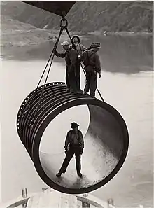 Workers building the dam received an average of 80¢ an hour; the payroll for the dam was among the largest in the nation. The workers were mainly pulled from Grant, Lincoln, Douglas, and Okanogan counties and women were allowed to work only in the dorms and the cookhouse.[53] Around 8,000 people worked on the project, and Frank A. Banks served as the chief construction engineer. Bert A. Hall was the chief inspector who would accept the dam from the contractors. Orin G. Patch served as the chief of concrete.[20][54][55] Construction conditions were dangerous and 77 workers died.[25]