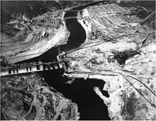 To prepare for construction, housing for workers was needed along with four bridges downstream of the dam site, one of which, the Grand Coulee Bridge, exists today. The Bureau of Reclamation provided housing and located their administrative building at Engineer's Town, which was directly downstream of the construction site on the west side of the river.[29] Opposite Engineer's Town, MWAK constructed Mason City in 1934. Mason city contained a hospital, post office, electricity and other amenities along with a population of 3,000. Three-bedroom houses in the city were rented for $32 a month.[56] Of the two living areas, Engineer's City was considered to have the better housing.[57] Several other living areas formed around the construction site in an area known as Shack Town, which did not have reliable access to electricity and the same amenities as the other towns.[58] Incorporated in 1935, the city of Grand Coulee supported workers as well and is just west of the dam on the plateau.[59] MWAK eventually sold Mason City to Reclamation in 1937 before its contract was completed.[60] In 1956, Reclamation combined both Mason City and Engineer's Town to form the city of Coulee Dam. It was incorporated as a city in February 1959.[57]