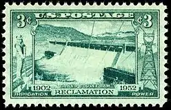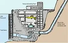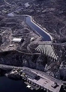 On August 4, 1934, President Franklin D. Roosevelt visited the construction site and was impressed by the project and its purpose.[35] He spoke to workers and spectators, closing with this statement: "I leave here today with the feeling that this work is well undertaken; that we are going ahead with a useful project, and we are going to see it through for the benefit of our country."[36] Soon afterward, Reclamation was allowed to proceed with the high dam plan but faced the problems of transitioning the design and negotiating an altered contract with MWAK. In June 1935, for an additional $7 million, MWAK and Six Companies, Inc. agreed to join together as Consolidated Builders Inc. and construct the high dam. Six Companies had just finished the Hoover Dam and was nearing completion of Parker Dam. The new design, chosen and approved by the Reclamation office in Denver, included several improvements, one of which was the irrigation pumping plant.[35]