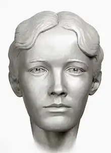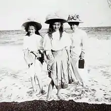 Olga had chestnut-blonde hair, bright blue eyes, a broad face, and an upturned nose. When she was 10, her tutor Pierre Gilliard reflected that she was "very fair" with "sparkling, mischievous eyes and a slightly retrousee nose."[1] Baroness Sophie Buxhoeveden, her mother's lady-in-waiting, reflected that "[she] was fair and tall, with smiling blue eyes, a somewhat short nose, which she called 'my humble snub,' and lovely teeth."[2] She was considered less pretty than her sisters, Tatiana and Maria,[3] though her appearance improved as she grew older. "As a child she was plain, at fifteen she was beautiful", wrote her mother's friend Lili Dehn. "She was slightly above the medium height, with a fresh complexion, deep blue eyes, quantities of light chestnut hair, and pretty hands and feet."[4] In her memoirs, Meriel Buchanan described the physical appearance of the 17-year-old Olga at an imperial ball in 1912: "She had not the regular features, the almost mystical beauty of her sister, Tatiana Nikolaevna, but with her rather tip-tilted nose, her wide laughing mouth, her sparkling blue eyes, she had a charm, a freshness, an enchanting exuberance that made her irresistible."[5]