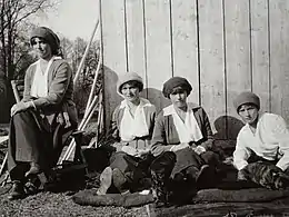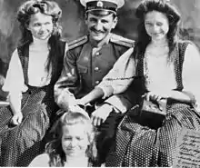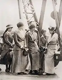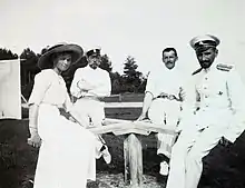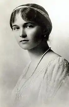 Before World War I, there was some discussion of a marriage between Olga and Prince Carol of Romania. In 1914, Foreign Minister Sergey Sazonov advocated the match because he wanted to ensure that the Romanian royal family would support Russia in case of a future conflict.[62] Nicholas and Alexandra saw the benefits of the match, but they insisted that "the grand duchess's marriage ... should take place only as the result of a much closer acquaintance between the young people and on the absolute condition of their daughter's voluntary agreement to it."[63] In March 1914, Crown Prince Ferdinand of Romania, Crown Princess Marie of Romania, and Prince Carol of Romania visited the Romanovs in St. Petersburg. Despite going on walks and dinners with each other, Olga and Carol seemed uninterested in each other. During a visit to Romania in the spring of 1914, Olga and Carol were uninterested in each other and did not speak to each other.[64] Crown Princess Marie of Romania noted that Carol was "not enamored of Olga's broad, plain face and brusque manner."[65] She judged that Olga's face "was too broad, her cheekbones too high,"[66] and she told her mother that all of the grand duchesses "were not found very pretty."[67] Marthe Bibesco, who was with the Romanian party, heard a rumor that the grand duchesses had "decided... to make themselves as ugly as they could.... so that Carol should not fall in love with any of them."[68]