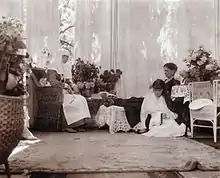 Olga cared for and pitied the soldiers she helped to treat. However, the stress of caring for wounded, dying men eventually also took its toll on the sensitive, moody Olga's nerves. Her sister Maria reported in a letter that Olga broke three panes of a window on a "caprice" with her umbrella on 5 September 1915.[83] On another occasion, she destroyed items in a cloakroom when she was "in a rage", according to the memoirs of Valentina Chebotareva. On 19 October 1915 she was assigned office work at the hospital because she was no longer able to bear the gore of the operating theater. She was given arsenic injections in October 1915, at the time considered a treatment for depression or nervous disorders.[84] Baroness Sophie Buxhoeveden, one of her mother's ladies in waiting, recalled that Olga had to give up nursing and instead only supervised the hospital wards because she had "overtired herself" and became "nervous and anaemic."[85]