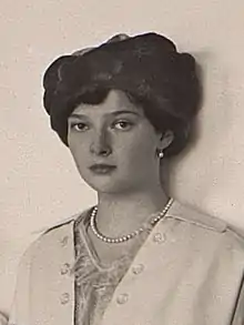 Tatiana was a famous beauty. She was tall, slender, and elegant. She had dark auburn hair, gray eyes, and fine features. Many viewed her as the most beautiful of the four grand duchesses and the one who resembled their mother most.[2][3][4] Her mother's lady-in-waiting Baroness Sophie Buxhoeveden reflected that "Tatiana was, to my mind, prettier than her sisters. She was taller than her mother, but so thin and so well built that her height was not a hindrance to her attractiveness. She had beautiful, regular features, and resembled some of the famous beauties among her royal relatives, whose family portraits decorated the walls of the palace.. She had dark hair, a rather pale complexion, and wide-apart eyes, that gave her a poetic far-away look."[5] General Count Alexander Grabbe, Major-General of His Imperial Majesty's Own Convoy, wrote that "the prettiest of the Grand Duchesses was Tatiana, the Tsar's second daughter. In her physical appearance and her serious and ardent nature, she most resembled her mother. Slender with auburn hair and clear gray eyes, she was strikingly good looking and enjoyed the attention her beauty commanded."[6] According to Anna Vyrubova, "when Tatiana grew up, she was the tallest and most graceful of all the Grand Duchesses, beautiful and romantic. Many officers fell in love with Tatiana, but there were no appropriate suitors for her."[7] Meriel Buchanan described her beauty as "almost mystical."[8] Alexander Mossolov, head of the Imperial Chancellery, wrote that Tatiana was "the best-looking of all the sisters."[9] Her paternal aunt Xenia said that "Tatiana and her mother are like as two peas in a pod!.... so pretty."[10] Her nanny Margaretta Eagar wrote that she was "a very pretty child, remarkably like her mother, but delicate in appearance."[11] In 1900, the British magazine, Woman at Home, wrote that "the flower of the flock, as far as looks are concerned ... is Grand Duchess Tatiana."[12] Nicholas wrote that Tatiana was "a very beautiful child"[13] and he often remarked that she reminded him of Alexandra.[14] When she was 8, her tutor Pierre Gilliard said that she "was prettier than her sister."[15]
