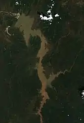 First phase of filling the reservoir began in July 2020 and in August 2020 water level increased to 540 meters (40 meters higher than the bottom of the river which is at 500 meters above sea level).[1][13] The second phase of filling was completed on 19 July 2021, water level increased to around 575 meters.[14] The third filling was completed on 12 August 2022 to a level of 600 metres (2,000 ft). Fourth filling was completed on 11 September 2023 with water level at around 625 meters. Actual water level (1 September 2023) is at around 620 meters and was measured at Sentinel images. It will take between 4 and 7 years to fill with water,[15] depending on hydrologic conditions during the filling period.[16]